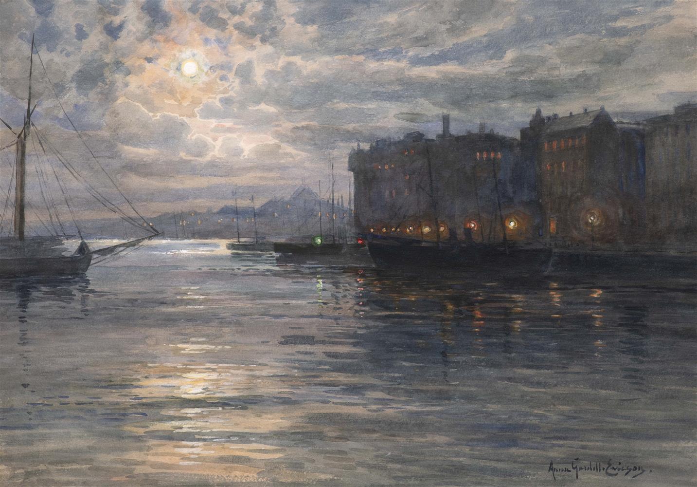 I Motiv från Stockholm har Anna Gardell-Ericson sannolikt skildrat en utblick från Nybrokajen mot Blasieholmen och ännu längre bort Skeppsholmen, där den Pantheonliknande Skeppsholms kyrkas överbyggnad dunkelt framträder mot skyn. Gardell-Ericsons akvareller har ofta en stark prägel av silverdis och de kännetecknas vanligen av en mjuk och säker ljusbehandling. Den aktuella Motiv från Stockholm är även på det viset mycket typisk för konstnären. Här har hon fångat huvudstaden i månljus då det säregna, silvriga ljuset dröjer sig kvar och återspeglas på vattenytan i ett skimmer av svaga, ljusa toner. Månen hänger högt på himlen och får Nybroviken att förtonas i schatteringar av blått och djupt violett. De karaktäristiskt blossaktiga gaslyktorna blir vackert skildrade ljuspunkter längst kajen där skutorna ligger förtöjda. Mitt i scenen ser man även ett par lanternor som med sina röda och gröna färger sticker ut i den förhållandevis dämpade koloriten, och Gardell-Ericson har dessutom skickligt återgivit samtliga ljuskällors återkastningar i vattenspegeln. Denna stämningsmättade akvarell med sina snabbt drivande moln och fylliga månljus har dragningar till en romantisk estetik, som Anna Gardell-Ericson fångar med imponerande inlevelse. (ME)