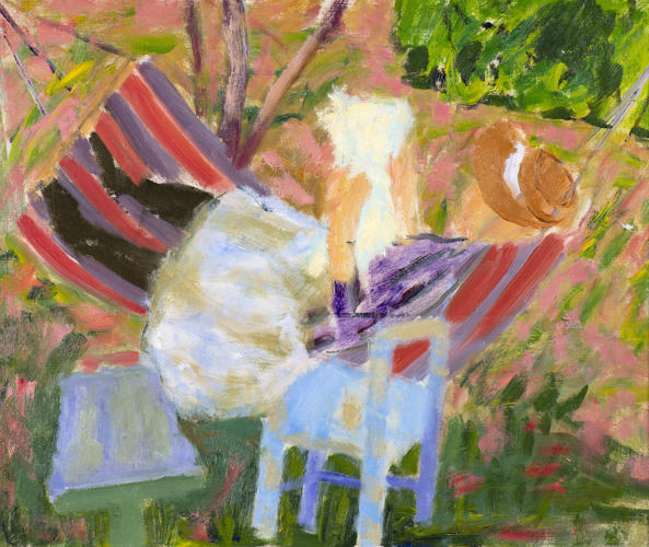 I hängmattan tillkom 1935 då Ragnar Sandberg han utförde några av sina allra mest uppskattade målningar. Den gula färgen som här anslår en lekfull ton och skänker en känsla av sommar, vilket kännetecknar konstnärens verk från denna tid. Målningen domineras av ockra, gröna, röda och rosa toner med inslag av vitt och ljusblått och föreställer en kvinna i solhatt som ligger avslappnat i en hängmatta, läsandes en tidning i en sommargrönskande trädgård. För att skapa en effektfull brytning i bilden, så har konstnären valt att måla kvinnans ben och fötter svarta, i samklang med de mörklila ränder som ger form åt hennes blus. Sandbergs koloristiska skicklighet och ljusbehandling kommer här till sin rätt och det sorglösa motivet står i kontrast till de dystra stadsskildringar som så ofta förekommer i 1930-talets bildvärld.