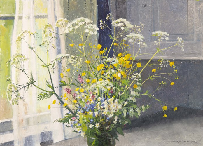 För Hjortzberg kom blommorna gradvis att smyga sig in i hans konst. Från början var det mest som dekorativa inslag i hans religiösa monumentalmåleri, för att sedan på allvar ta plats i hans konstnärskap och bli hans verkliga specialitet. I detta harmoniska blomsterstilleben från 1942, då konstnären var 70 år fyllda, skimrar den brokiga buketten i ljuset som strömmar in genom den skira gardinen. Blomsterfånget är raffinerat återgivet i det att varje ängsblomma tillåts stå ut ur mängden. Kompositionen är karakteristisk för Hjortzbergs mogna måleri där de lätta penseldragen är av en mästares hand, målade i en klar färgskala som för tankarna till såväl den italienska ungrenässansen som den orientaliska konst han kom i kontakt med under sina studievistelser i unga år. Samtidigt är målningen framför allt en syntes av den svenska sommaren: den vilda och fria. Ängsblommor är ett delikat blomsterstilleben, inte mindre beundransvärd genom kompositionens enkla storhet och Hjortzbergs otvungna, naturalistiska gestaltning. Blommornas prakt blir här till en manifestation för den outsinliga, eviga floran framställd med en frisk kolorit sprakande i sommarens alla färger.