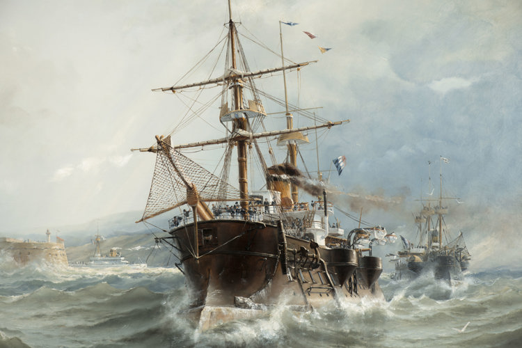 Franska pansarfregatter utanför Cherbourg. Olja på duk, 200 x 168 cm, signerad och daterad H. af Sillén 1889.