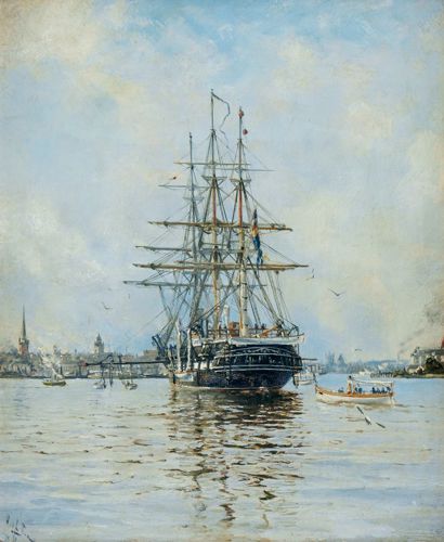 Fregatten Vanadis på Stockholms ström. Olja på papper lagt på papp-pannå, 45,5 x 38 cm. Signerad och daterad H. af S-n 88.