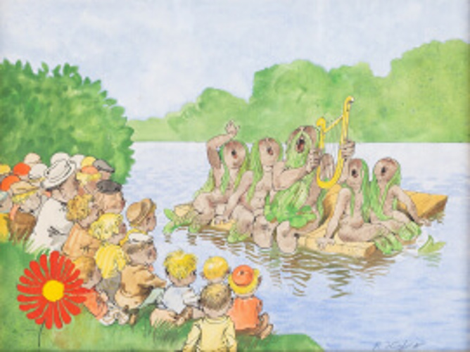 Konsert vid sjön. Akvarell, 23 x 37 cm. Signerad "R. Högfeldt".