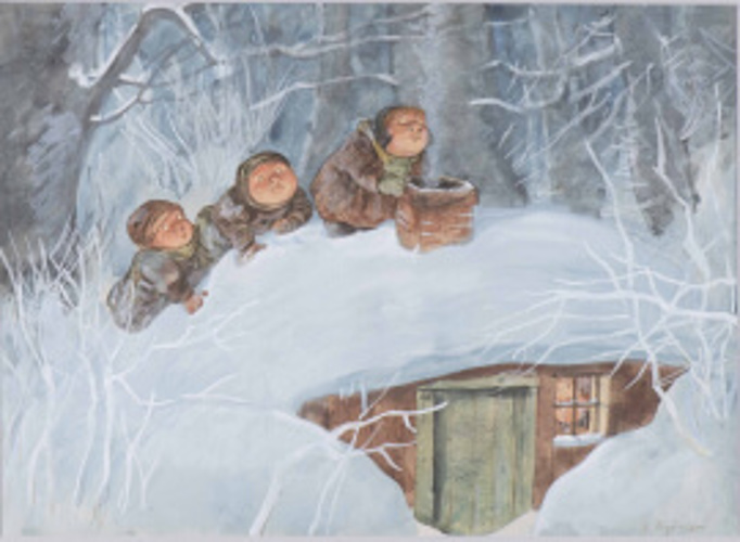Oväntat besök. Akvarell, tusch och blyerts, 27 x 37 cm. Signerad "R. Högfeldt".